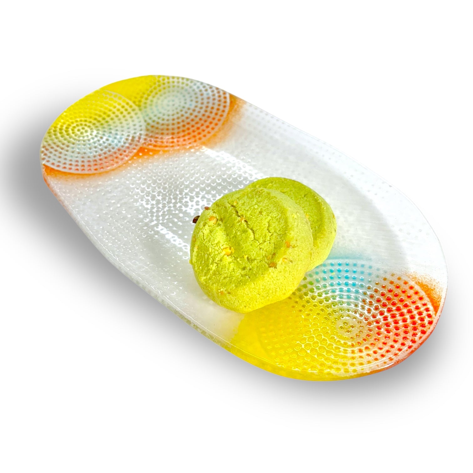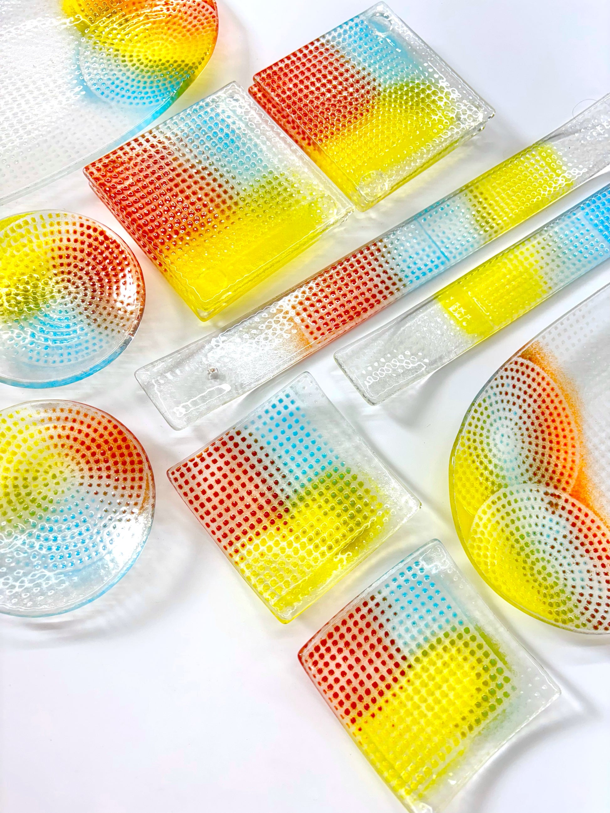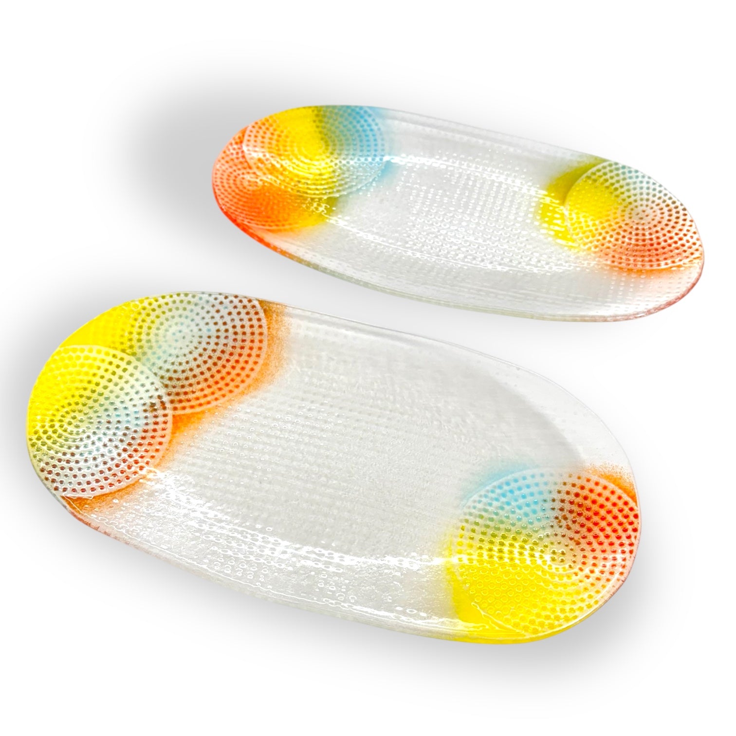 Each Pixelated Oval Plate is handmade with care in the ATI Lab. What makes these plates so special? It’s the unique process used to create the colorful glass patterns on the surface. Inspired by printmaking, vibrant glass powders in a variety of hues are sifted through screens, revealing a striking, pixelated design. After being fused in the kiln, this beautiful pattern is permanently locked in, creating a stunning fusion of color and texture.