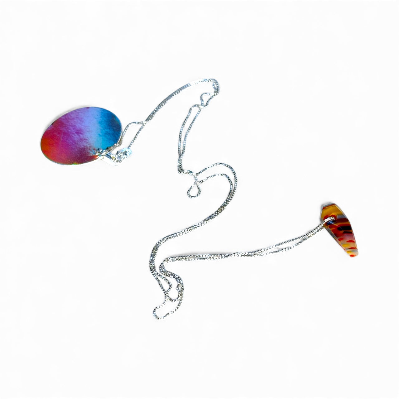 Fused + carved glass, sterling silver box chain.